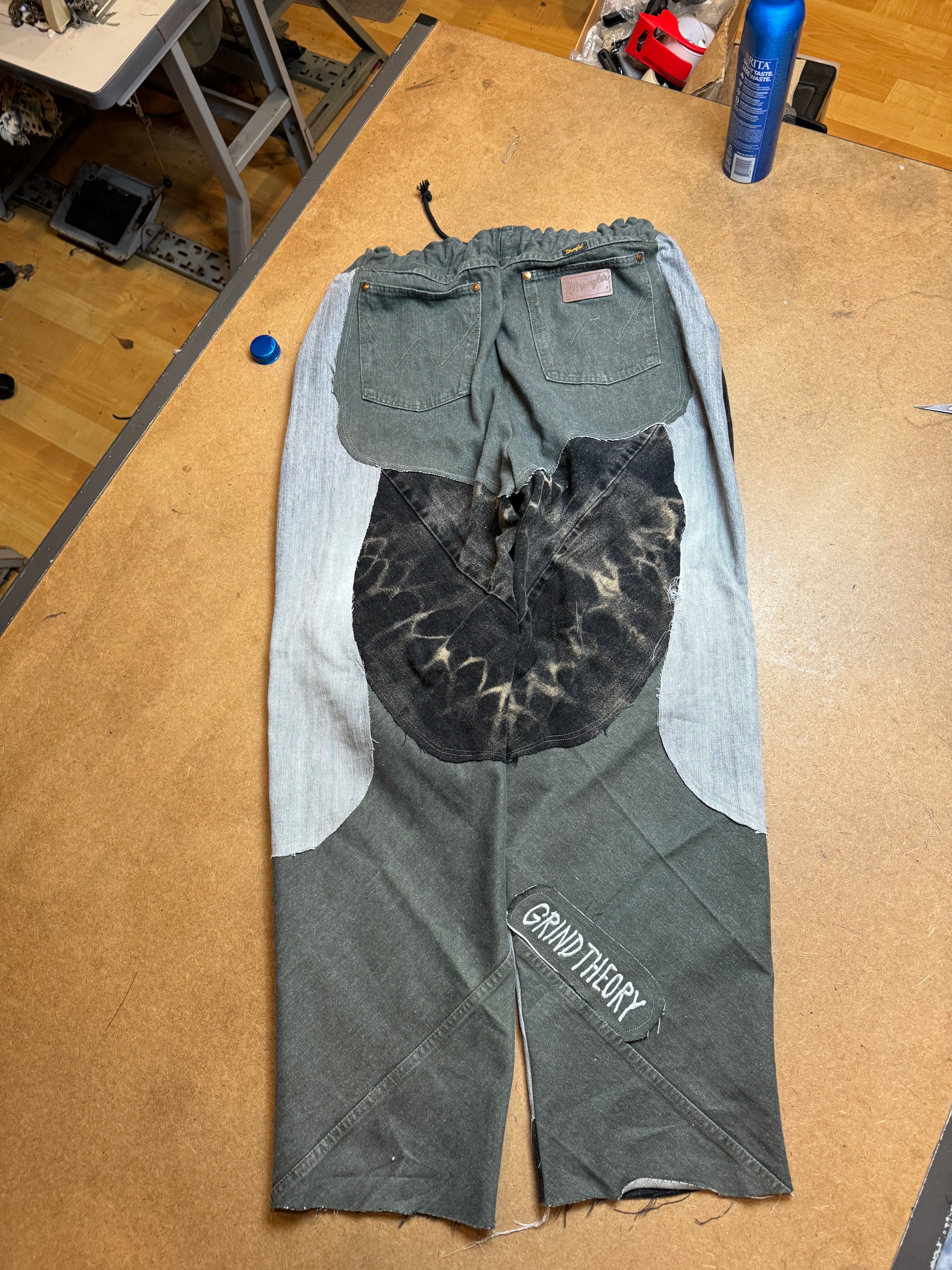 Made from three pairs of vintage denim pants that were reimagined as one piece of wearable art. Pleats around the knees for added mobility and function. Adjustable drawstring waistband